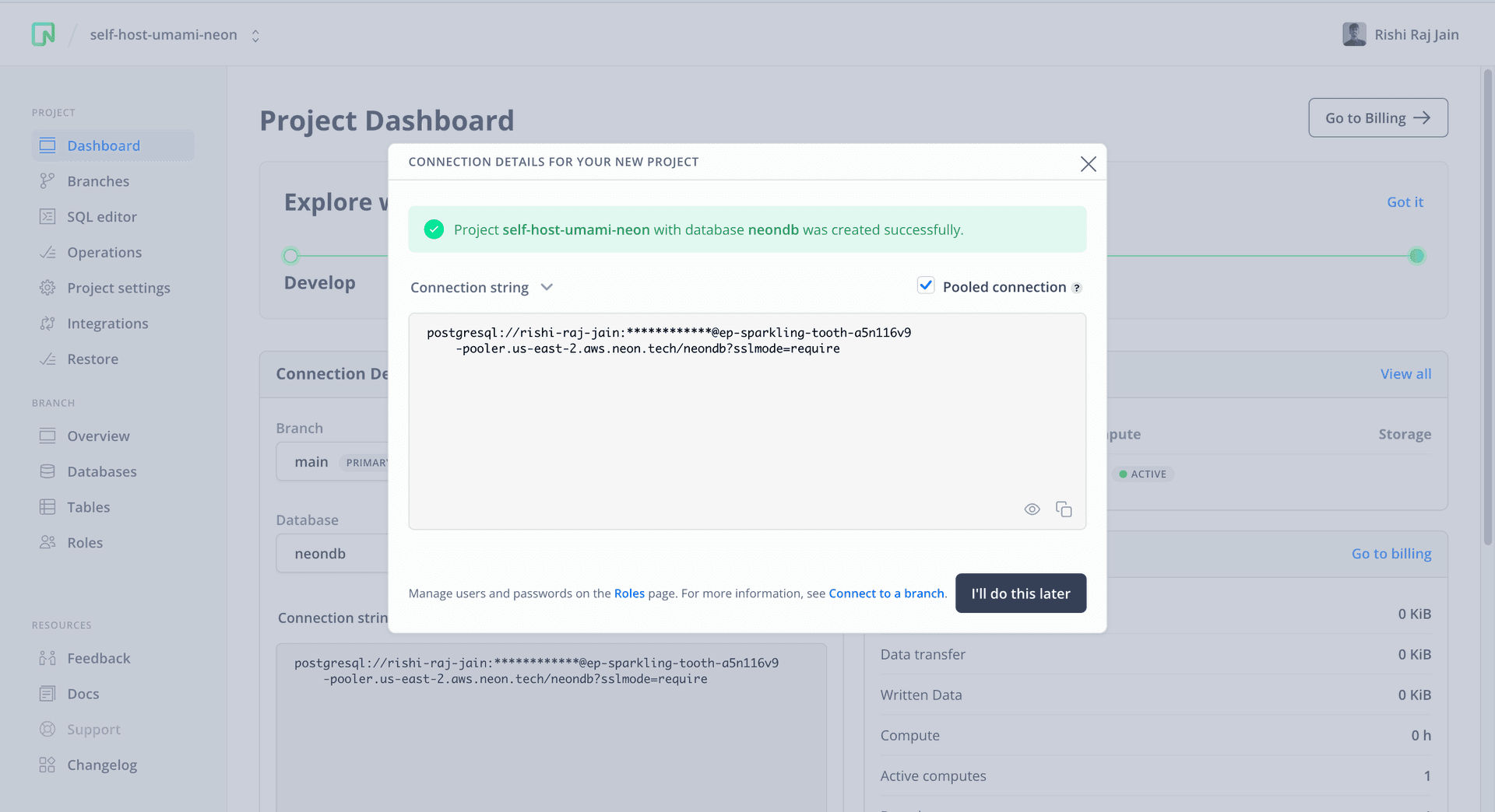 Configure Neon Postgres as serverless database for self-hosted Umami analytics